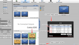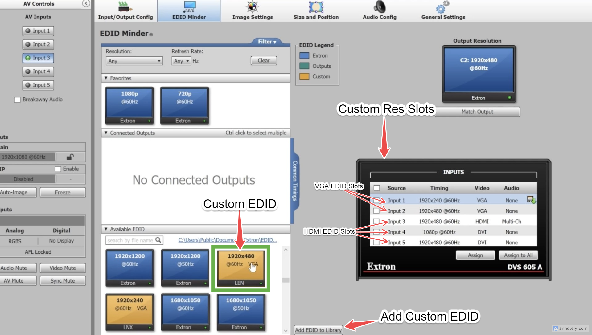 Install the PCS and connect the DVS 605 by USB mini. In the PCS, go to the second tab titled ‘EDID Minder’. Custom Resolutions are located in the table on the right labelled ‘INPUTS’. The Extron DVS 605 can take up to 5 custom resolutions via EDID.bin files. The first 2 slots are for VGA EDIDs and the next 3 are for HDMI/DVI. The EDIDs are just software-embedded with a connection type, and the DVS 605 can output any of the 5 custom resolutions to any physical output.